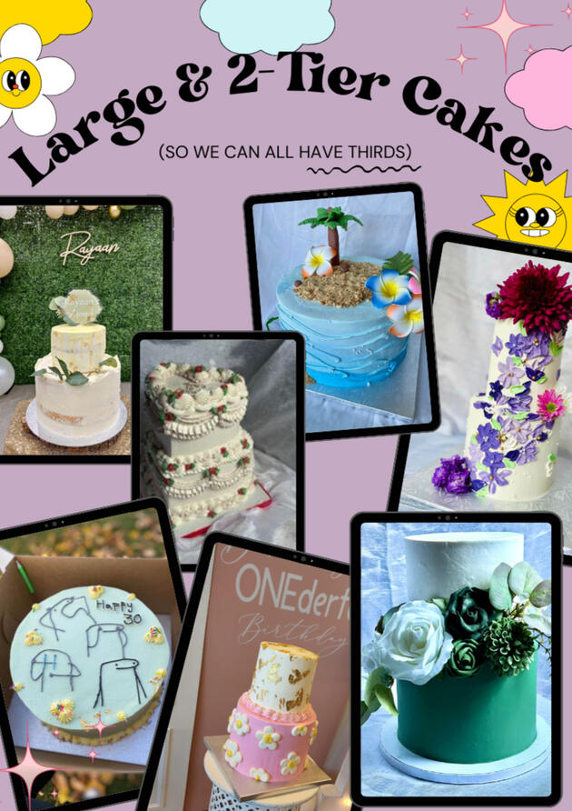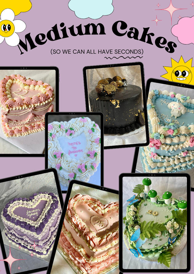 Ready to turn your cake dreams into reality? Dive into our delightful options and place your order by clicking the link below. Located in Brampton, Ontario with availability in Mississauga as well.Indulge in tiered cakes, with prices varying based on size. Starting at $120 for our charming two-tier (4" stacked on a 6"), the cost elevates with your chosen design.Add a touch of love with a heart-shaped cake for just $5 extra (complimentary for lunch box size). Keep in mind, that these are base prices; intricate designs like our vintage masterpieces may add a dash of magic and influence the final cost. Let's craft the perfect confection for you!Our Sizes: Lunch Box (4"x 2") , Mini Cake (4"x4"), Small (6"x4"), Medium (8"x4") and Large (10"x3.5")